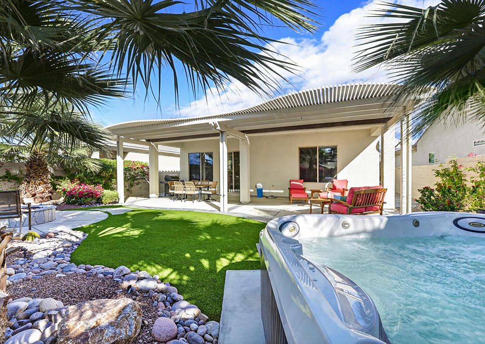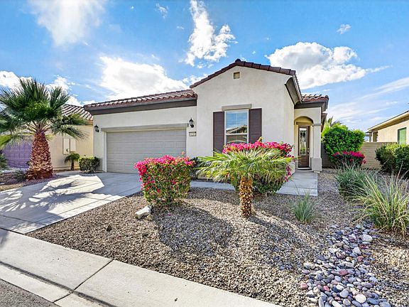 Charming and beautifully maintained Embark floor plan offering 1,321 sq. ft. (EST.) of bright, open living in the highly desirable Phase 3 of Sun City Shadow Hills, a premier 55+ active adult community. This inviting 2-bedroom, 2-bathroom built in 2012 home blends comfort, style, and effortless indoor-outdoor living--perfect as a full-time residence or a serene desert getaway. Inside, you'll find a spacious great room filled with natural light and warm neutral tones, creating a welcoming atmosphere for everyday living and entertaining. The well-appointed kitchen features rich wood cabinetry, granite countertops, a center island with bar seating, and abundant storage--ideal for cooking, hosting, and enjoying time with guests. The primary suite offers a walk-in closet and an en-suite bath with dual sinks and a step-in shower. A comfortable guest bedroom and adjacent full guest bath ensure your visitors feel right at home. Outside, your personal desert sanctuary awaits. The extended covered patio provides generous space for lounging or dining al fresco will pull-down privacy screens, while the beautifully landscaped backyard showcases mature palms, vibrant greenery, artificial turf, and a private spa. A stylish built-in fire pit creates the perfect setting for cozy evenings under the desert sky. Enjoy a south-facing backyard providing beautiful sunshine year-round. Additional highlights include diagonal tile flooring throughout the home, a decorative glass entry door, and an attached 2-car garage. Here at Sun City Shadow Hills, residents enjoy an unmatched lifestyle including resort-style amenities including two clubhouses, two golf courses, pools and spas, fitness centers, tennis and pickleball courts, social clubs, and 24-hour security. Comfort, charm, and resort-style living--your desert oasis awaits!