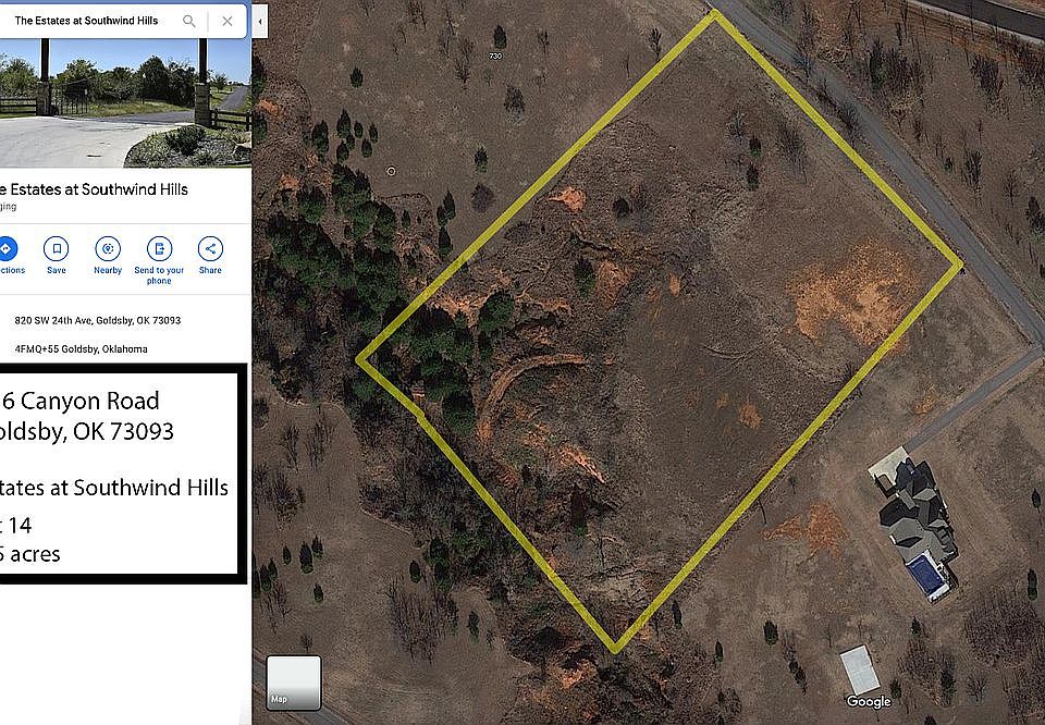 FOR BEST INFORMATION CALL Josh at 405-326-9636 Open to offers/Price Negotiable 5.5 Acres of land in the highly sought after area of Southwind Hills Estates, located on Southwinds Lane. Gated Estates; The land has utilities ready for building your dream home. Estate HOA requires a minimum build of 2,750 Sq Ft. Home Lot #14 Gorgeous views with 4.5 acres of useable land, and about an acre of canyon perfect for exploring with your family, and a cliff that creates a beautiful waterfall when it rains or snows.