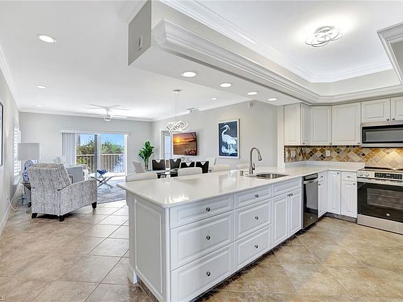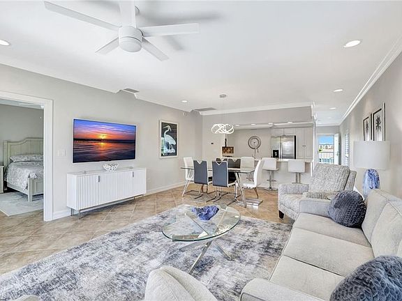 Rarely available top-floor corner residence at Villa Del Mare, showcasing sweeping views of Smokehouse Bay! This beautifully updated condo features tile flooring throughout, impact-resistant windows and doors, and a bright, open-concept design. The modern kitchen overlooks the living area and balcony, highlighted by quartz countertops and stainless-steel appliances. Offering 2 bedrooms, 2 full bathrooms, and a full-size washer and dryer, this spacious waterfront residence blends comfort with everyday convenience. The expansive balcony is ideal for relaxing and enjoying the bay views, and it includes a generous storage closet for added functionality. Just a 5-minute stroll to The Esplanade, you'll experience premier island living with shops, dining, and entertainment right at your fingertips. Villa Del Mar residents enjoy a large waterside pool, a common dock for boating, and this unit comes with covered parking space #10—perfectly positioned next to the elevator. Opportunities like this are rare—secure your piece of premium waterfront living today!