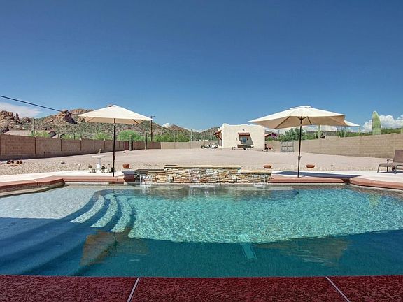 Gorgeous custom home with North/South exposure in Apache Junction! Kitchen is upgraded with granite countertops, a plethora of 42'' custom cabinets and stainless steel appliances. Master suite has new, plush carpeting with a private exit to backyard, a spa like bathroom with a dual sink vanity, separate soaking tub + shower and a spacious walk in closet! Brand new carpet in all bedrooms! Oversized backyard features an extended covered patio with sparkling PebbleTech pool, RV gate, tons of open space and a detached garage/guest house for all your toys! The garage/guest house is perfect for someone to run their business out of as well! Home is just 1/2 mile to the entrance of Bulldog Pass and endless miles of trails! This will go quickly so come see it today!