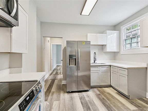 Step inside to find freshly updated interiors with neutral tones and wide-plank luxury vinyl flooring throughout. The kitchens feature quartz countertops, soft-close cabinetry, and stainless steel appliances including a refrigerator, range, and microwave. Ceiling fans in every bedroom provide added comfort, while dedicated laundry hookups offer convenience.