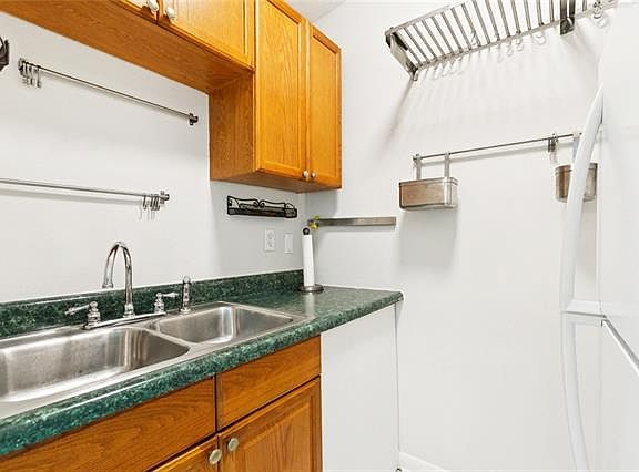 Private rear studioQuiet retreatFull-size refrigeratorDouble sinkCompact kitchen setupOpen layoutModern finishes
