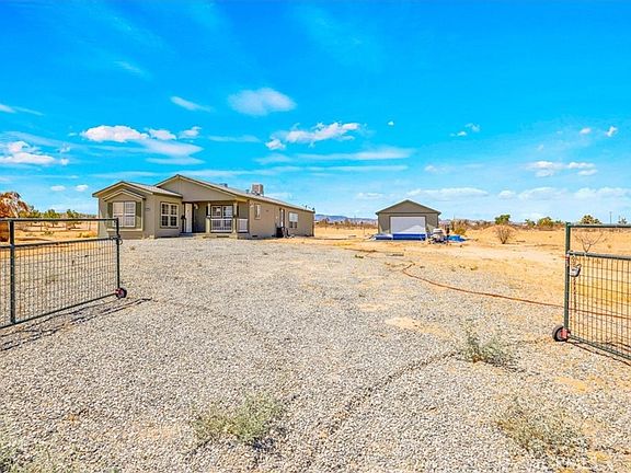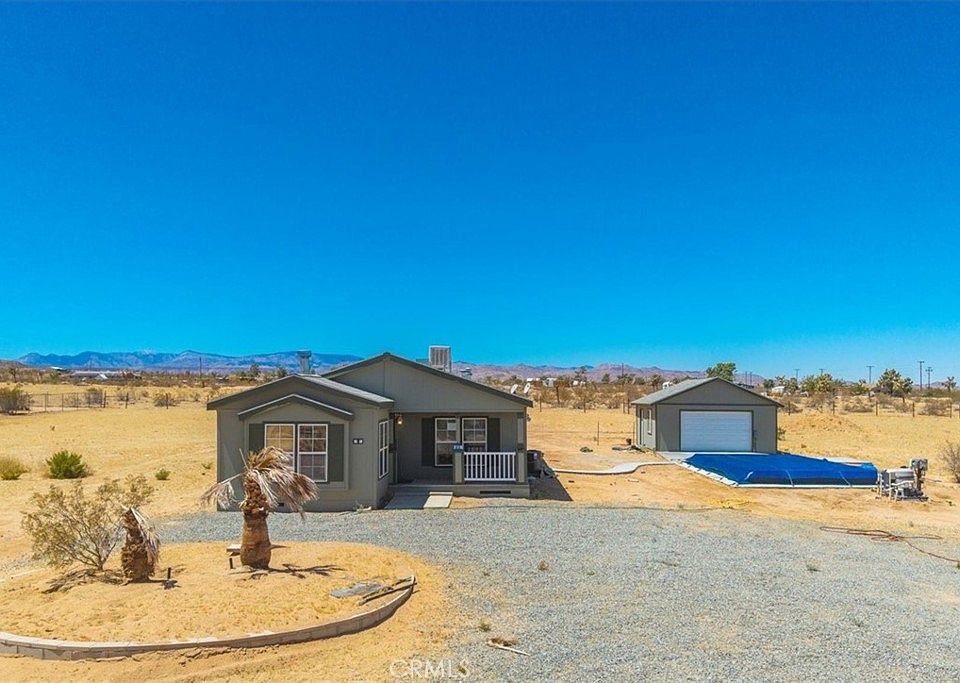 Set on 2.27 acres of open desert land in Landers, this 3 bedroom, 2 bath manufactured home offers space, comfort, and a rare heated POOL for year-round enjoyment. A welcoming wooden front deck sets the tone, inviting you into a large living room with carpeted floors, a cozy fireplace, and ample windows that bring in natural light and showcase sweeping views of the surrounding landscape. The kitchen is spacious and functional, featuring wood-look flooring, warm wood cabinetry, and an open dining area perfect for everyday meals or gatherings. A separate laundry room with outdoor access adds convenience. The home includes two guest bedrooms—each nicely sized and well lit. The guest bathroom is large, with a tub/shower combo and jack-and-jill access to one of the bedrooms, making it ideal for shared living or guests. A second living space provides additional flexibility and includes built-in shelving and a recessed entertainment nook, perfect for creating a media room, home office, or den. The primary bedroom is generously sized and offers a walk-in closet and a private ensuite bath with a walk-in shower and separate garden tub for soaking. Outside, the heated pool offers a rare luxury in the high desert, perfect for enjoying warm days and starry nights. With over two acres of land, there's room to roam, garden, or simply take in the quiet desert beauty. This property combines privacy, comfort, and functionality in one of the most peaceful corners of the Morongo Basin.