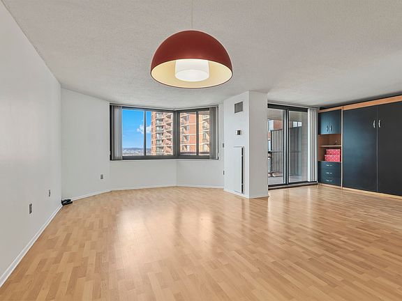 Freshly painted! Experience city living at its finest in this stunning, renovated studio apartment. Nestled on the 8th floor, this 687 sq ft gem of modern living space with sleeping alcove & a sliding glass door boasts breathtaking Hackensack River views and magnificent sunsets from its private walk-out terrace. OPEN & Modern Kitchen features plenty of kitchen cabinets, Pantry & Stainless steel appliances (Dishwasher, Oven/ Electric range & Microwave). Oversized & Upgraded Bathroom. Large Wrap- around windows fill the space with natural light, creating a warm and inviting ambiance. Sleeping alcove with an attached Murphy bed (Queen size) and ample storage. Upgraded Windows & Balcony door, In-Unit Washer/dryer and central AC/Heat, Assigned Covered Parking for 1 car included (deeded with unit), for Ultimate comfort