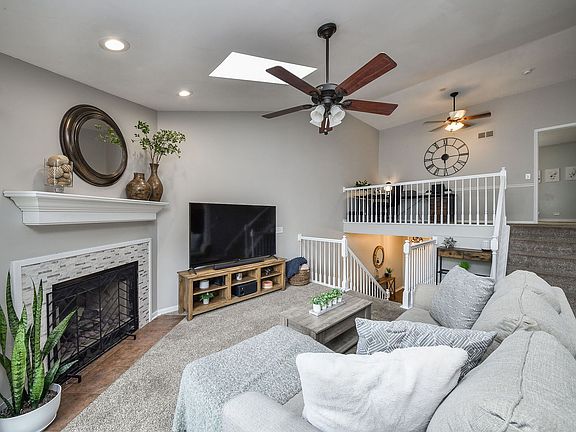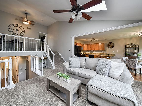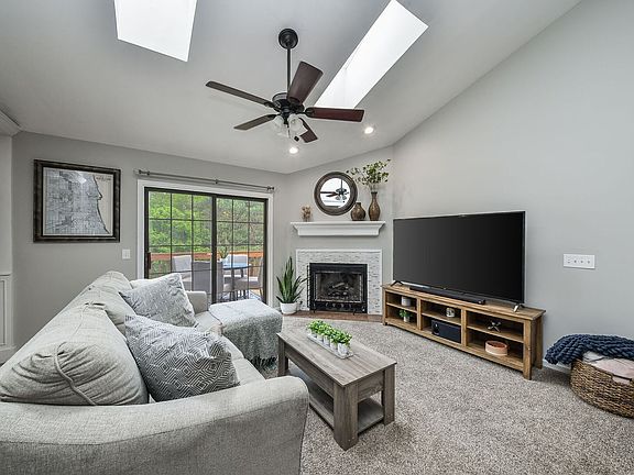 Beautifully designed end-unit townhome with a spacious open-concept floor plan. The bright and airy living room features soaring ceilings with a skylight, a cozy fireplace, and seamless access to a large private deck-perfect for entertaining or relaxing with a peaceful view. The expansive kitchen offers a breakfast bar, generous counter space, and a roomy eat-in area ideal for casual dining. The primary suite is a true retreat, boasting an oversized walk-in closet and a luxurious en-suite bath with double vanities, a jetted soaking tub, and a separate shower. The open loft offers a stunning vantage point, overlooking the spacious living room below and filling the space with natural light. Perfect as a home office, reading nook, or creative studio, this airy retreat combines function with style. The walk-out lower level includes a comfortable family room, a second bedroom, another full bath, and a laundry room for added convenience. Don't miss this serene home with plenty of space and natural light throughout. Ideal location... close to Randall Rd. with abundant shopping & restaurants with easy access to I-90!