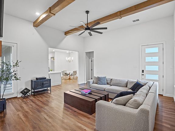 - Beamed Ceilings, Built-in Features, Ceiling Fan(s), High Ceilings, Kitchen Island, Open Floorplan, Pantry, Quartz Counters, Solid Surface Counters, Vaulted Ceiling(s), Walk-In Closet(s)