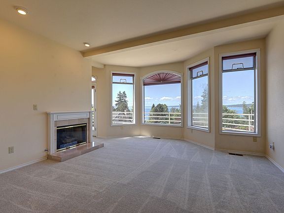 Absolutely beautiful home with great views of Puget Sound. Primary suite includes full bath and large closet with two decks and more. Large kitchen, dining room, eating area, living room, bonus room and most west facing rooms have views. Gas fireplaces in primary bedroom and living room. Two bedrooms have an adjoining bathroom. Two level decks that wrap the entire front of home. All appliances, Basement features the utility room, extra bedroom, full bathroom and 2 car garage w/remotes. Great park-like yard with stairs and pathways, large deck, gazebo and area to play. A must see! One cat or small dog possible with approval.