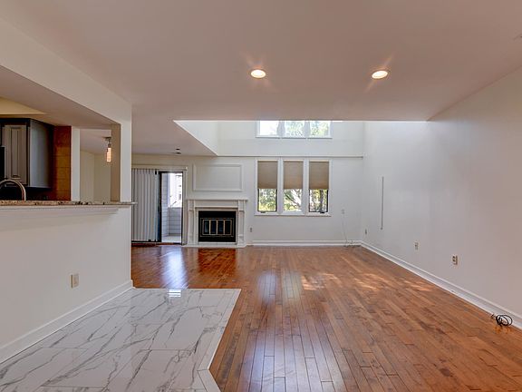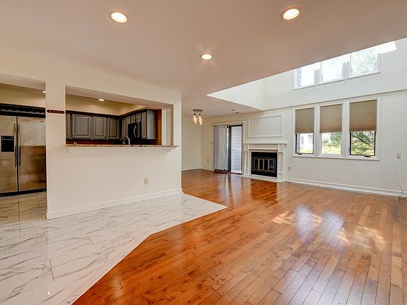 The spacious living and dining room features a wood-burning fireplace, soaring lofted ceilings, and skylights that fill the space with natural light. The fully renovated gourmet kitchen is a chef's delight, with abundant cabinets, stainless-steel appliances, quartz countertops, and a breakfast bar.