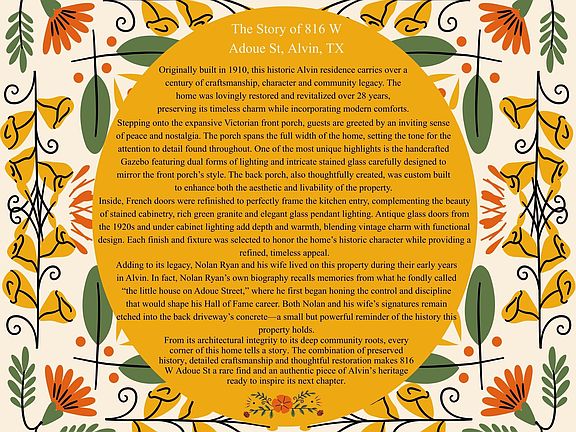 Step into a piece of Alvin's history with this 1910 Victorian beauty sitting proudly on a corner lot over one-third of an acre in the heart of Alvin. Rich with history and charm, this home showcases ornate woodwork, a wraparound front porch with an attached gazebo, and timeless craftsmanship throughout. Adding to its story, Nolan Ryan’s wife grew up here, and the Hall of Famers signature is still etched into the back driveway—a truly unique piece of Texas history. Out back, you’ll find a 650 sq. ft. one-bedroom, one-bath apartment, perfect for guest space or rental income. And if you’re looking for even more potential, the adjacent third-acre lot (MLS #47014670) can be purchased as a package deal—combining both properties for a total of approximately 25,000 sq. ft. This is a rare opportunity to own a well-preserved piece of Alvin’s history—full of character, flexibility, and small-town charm.