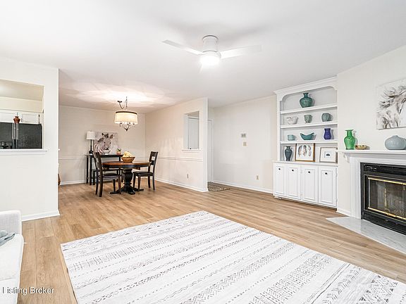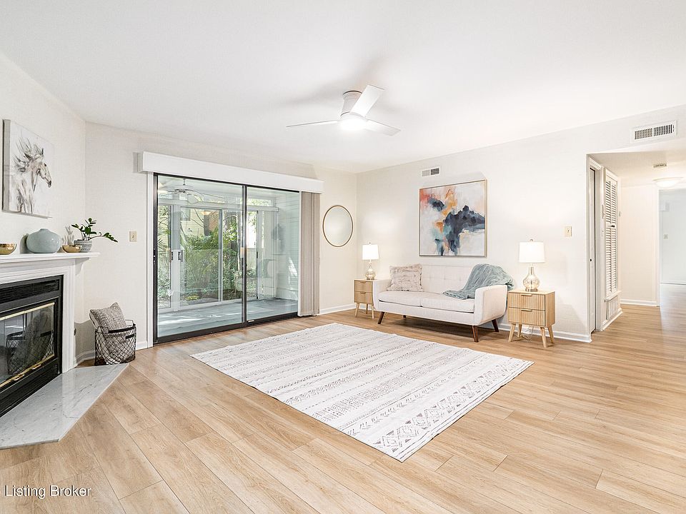 ST. MATTHEWS! Spacious and beautiful 2 bedroom, 2 bath condo with large Primary Suite that includes TWO walk in closets, en suite full bath PLUS pocket doors to another large room that overlooks enclosed patio. This room has multiple possibilities: office, family room, extension of Primary Suite, etc. First floor location with no steps. Recent wood plank luxury vinyl flooring throughout. Great Room has gas fireplace, separate dining area and opens onto light filled sun room. End unit. 1 car garage with keyless entry also comes with this condo. Community pool. Warwick Park nearby. Move-in ready! Hurry, this one won't last long.