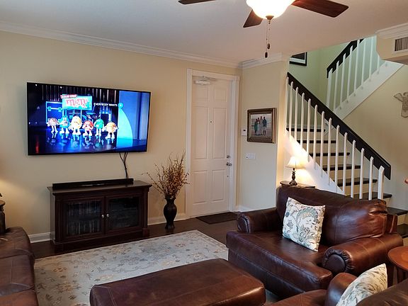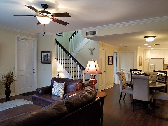Annual rental available March 1st. Three bedroom, three-bath townhome with pool in gated community of VeronaWalk. Enjoy sunsets with a lake view from the screened-in front porch and balcony. Porcelain wood-plank floors downstairs, new carpet upstairs. Located two blocks from the Town Center, where you will have access to all amenities, including a 24-hour fitness center, tennis and pickleball courts, resort pool, lap pool, children's playground, restaurant, ice cream parlor, and gas station. Included in rent: Pool service, basic cable, lawn maintenance, access to all amenities mentioned above, and monitored alarm with ADT (if you have a home or mobile phone). Attic space above garage is floored for extra storage. Sorry, no pets.