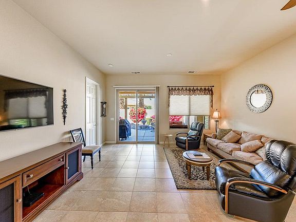 Available furnished or unfurnished. Welcome to the vibrant 55+ Sun City Shadow Hills. Enjoy the beauty and serenity of the desert in this lovely Lanai floor plan featuring 2 bedrooms, 2 baths, and turn-key furnishings or it can be offered unfurnished! Mountain top views are visible from the private backyard. Tile flooring and plantation shutters can be found throughout the entire home. The contemporary kitchen has stainless steel appliances and a stool height bar that overlooks the dining area. Enjoy the comforts of the master suite with mountain views and a huge master bath with a step in shower and walk in closet. The guest bedroom is on the opposite side of the home with its own private bath. The full-size 2 car garage has plenty of storage cabinets. Sun City Palm Desert is a nationally renowned active adult community with golf courses, pools, tennis, pickle ball, bocce ball, restaurants, social and activity clubs.