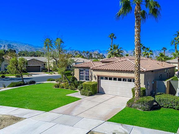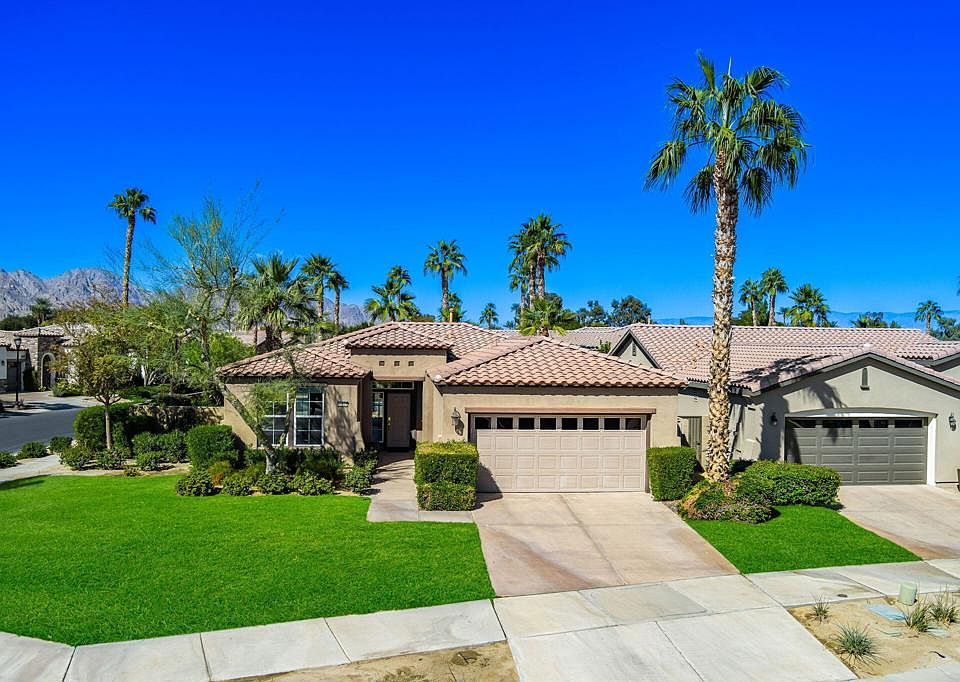 Life Well-Played! Big SW Mountain views, raised putting green, firepit, and patio dining in the round, make this home the perfect desert getaway. Located at Trilogy at La Quinta, this delightful 1,386 SQ FT Maurea model, two-bedroom, two baths home sets back off the street and is bright, cheerful and all you need to enjoy Trilogy's sublime golf and resort lifestyle. A recently added A/C and hot water heater, stainless range, new refrigerator and microwave have the heart of this home beating strong. The home rests on a slightly raised oversized 10,000+ SQ FT corner lot offering glorious Southwest sunset views from the front, side, and backyards. An open concept home, the nine-foot ceilings and big picture windows make it feel much larger. Outfitted with smooth tile floors, ceiling fans, and custom pull down solar shades the home offers cool comfort year-round. The kitchen is roomy with slab granite countertops and breakfast counter with seating for four. Ample wood cabinets, above and those below with pull-out drawers, and a pantry has all your dinnerware, utensils, pots and pans, and groceries well-organized. Serve up formal dinners in the large dining area or step through the sliding doors for barbecue on the covered patio, or fireside under the moon and stars. The primary bedroom suite is spacious with big picture windows overlooking the private backyard. Walk out the door to the back patio for an early morning pick-me-up or a nightcap before retiring. The primary bath features double vanities and a walk-in shower with bench seat and walk-in closet. The guest bedroom is at the front of the separate from the primary bedroom, with a mirrored wall closet and nearby bath with a shower and tub. The garage has ample space for two vehicles plus golf cart, and room for bikes, and some storage. Trilogy at La Quinta is a 55+active adult community of 1,238 homes on over 500 acres, and home to the Trilogy Golf Club and Kitchen Ten Eleven Restaurant. A resort community, residents enjoy Tennis, Pickleball, Bocce, an indoor lap pool and outdoor pool with spa and cabanas, surrounded by the breathtaking Santa Rosa and Coral Mountains. Exercise at the fitness center, join Zumba, Spin, and strength training classes, lift weights and run laps on the indoor track or on a treadmill. Clubs of every type and weekly entertainment keep the place humming with excitement.