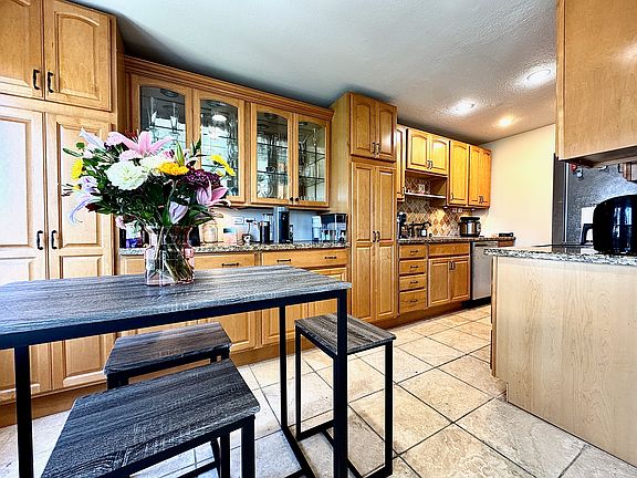 The interiors have been thoughtfully upgraded with designer finishes that strike a balance between sophistication and warmth. Travertine tile floors extend throughout the main living spaces, while plush carpeting in the bedrooms creates a cozy retreat. A contemporary kitchen showcases custom honey maple cabinetry with glass accents, granite and stone countertops, and a suite of stainless steel appliances including a 32-cubic-foot refrigerator, microwave, dishwasher, and stove. The open layout flows seamlessly into the living room, where a gas fireplace, recessed lighting (on dimmers) and built-in speakers set the stage for both entertaining and quiet evenings at home.