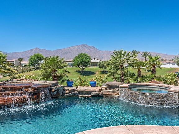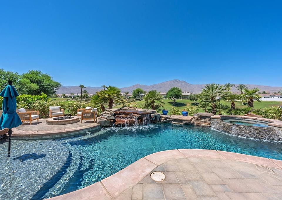 Ideally positioned on the 10th fairway of the Rees Jones-designed golf course, this beautifully appointed south-facing residence offers the perfect blend of luxury, comfort, and timeless design. Enter through a spacious private courtyard, where the gentle sound of a fountain sets a serene tone, and discover a detached two-bedroom casita complete with a cozy fireplace and kitchenette, perfect for hosting guests in style. Inside the main residence, the expansive great room is framed by soaring 12′ glass doors that blur the line between indoors and out, drawing your eye to breathtaking views of the Santa Rosa and Coral Mountains. The open concept layout flows effortlessly into the gourmet kitchen, featuring elegant waterfall countertops and top-tier appliances that make cooking a delight. The primary suite serves as a peaceful haven, seamlessly connecting to a spa-like bath and offering direct access to the backyard. Outside, you will find a private escape with a custom pool, built-in BBQ, and an inviting firepit that sets the stage for year-round entertaining and relaxation. Additional upgrades include an owned solar system, as well as a new HVAC system and a tankless water heater, both installed in May 2025. Come live the life you've always imagined!