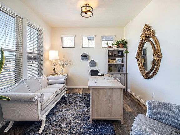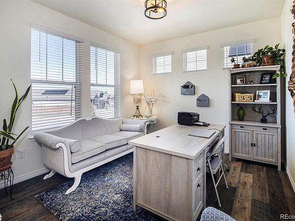 Built in 2020, this beautiful 3 bedroom plus office Lennar open floorplan ranch won't disappoint. Walk into tons of natural light with windows galore. This home has been appointed with lovely fixtures and a neutral palette, luxury vinyl flooring, 9ft ceilings with 8ft doors will make you feel grand. Enjoy entertaining with your gas stove at your 8ftx5ft island with seating for up to 6, 42in farmhouse shaker cabinets and stainless-steel appliances. Snuggle up in living room with your gas fireplace or entertain on your large, covered Trex deck. Located at the end of a quiet cul-de-sac you will find yourself wandering down the many paths that wind through the tall pine trees. You might even be greeted by the deer family residing there. Enjoy the community pool during hot summers. Full unfinished basement is ready for your design. New radon mitigation system and window well covers were installed in 2022. Sunnova Solar lease will be transferred. Cherry Creek School district, 7 minutes to King Soopers, Southlands Mall, Home Depot. 16 minutes to Parker, 21 min to DIA and 26 min to Anschutz Medical Center. Seller paid concession of $5000 paid to Buyer for closing costs or rate buydown.