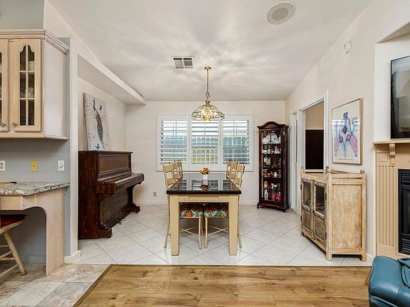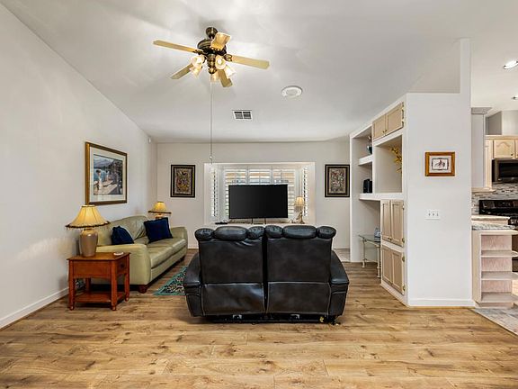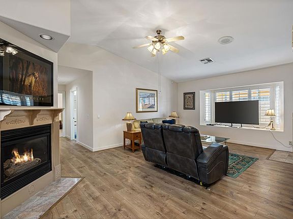 Beautiful Singe Family Home in a Desirable 55+ Gated Community. This home is NOT a manufactured home. Located in Desert Grove community. Low monthly HOA of only $265. Residents enjoy access to a refreshing pool, soothing spa, and a clubhouse complete with a pool table for socializing. RV parking is also available for a low fee. Step inside and be impressed by the open floor plan featuring 2 bedrooms, 3 bathrooms, a den, dining area, living room, and a versatile casita--perfect for a guest or a hobby room. The kitchen features a 5-burner gas range, granite countertops, beautiful backsplash, custom cabinetry, pantry, and a built-in desk area. The living room is warm and inviting with a cozy fireplace, built-in shelves, and storage cabinets. The primary suite is a relaxing retreat with a walk-in closet, dual vanities, and a walk-in shower. Additional highlights include: Large laundry room, plantation shutters, ceiling fans throughout, recessed lighting, and low-maintenance landscaping The third-car garage has been converted into a casita with a kitchenette, while the remaining 2 car garage space includes a workbench and built-in storage cabinets. This is a rare opportunity to own a beautifully upgraded stick built home in Desert Grove 55+ community!