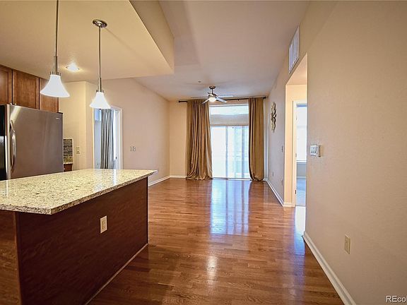 Ground floor security entrance and with few steps into the building. Modern kitchen with ample cabinets, granite counter tops with large center island open to family room. Access to patio from sliding glass door, looks out to lovely courtyard. Spacious primary bedroom with ensuite bathroom. Walk in closet off of bathroom. Additional bedroom and second 3/4 bathroom. Stack-able washer/dryer in a spacious laundry room off of kitchen. Underground assigned parking and storage spaces. Located in the desirable Lowry community near many dining choices, beer garden, and parks.
