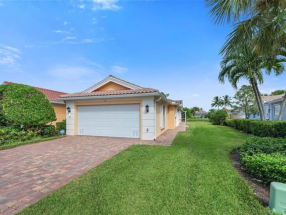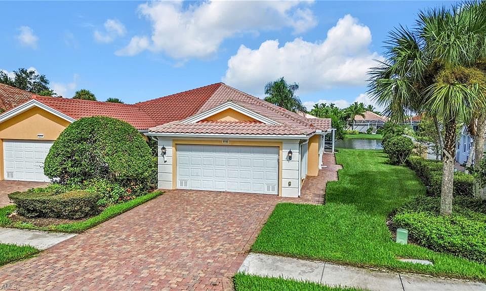 Check out our video link attached so you get a real feel inside this superb gated community Verona Walk property! This popular Capri attached villa, built of poured concrete by renowned developer DiVosta, sits on an oversized lakefront lot and offers 2 bedrooms, 2 baths, a flex/den, and a 2-car garage. The bright split-bedroom floor plan is ideal for visiting guests and family. Interior features include newly laid LVP Cortec flooring in bedrooms, freshly re-grouted natural tan tile flooring throughout the main living areas, vaulted ceilings, and a wall of windows bringing in natural light. The living room features a built-in wall unit for storage and display. The open kitchen has all appliances including a split sink and KOHLER garbage disposal, along with a newer LG stainless refrigerator. A full laundry room offers cabinetry, sink, glass block light, and pantry closet. Great storage throughout the property. Recent improvements equating to over $32,000 in upgrades within the past 12 months include two electric hurricane shutters on the lanai plus accordion storm shutters for the rest of the home, garage opener with keypad, new appliances, professional ductwork cleaning, interior painting in the house and garage, Cortec flooring in bedrooms, new ceiling fans, and more. Sliding glass doors open to a covered lanai with extended screened patio overlooking the water, complemented by an extended screen porch with a new roof screen. This home is just a 9-minute walk to the community amenities and three doors down from the bike path. Verona Walk offers resort-style amenities: resort pool, tennis, pickleball, fitness center, miles of walking trails, and a Town Center with café, restaurant, post office, salon, gas station, and ice cream/coffee shop. Low HOA fees add to the appeal. Offered unfurnished but open to negotiation.