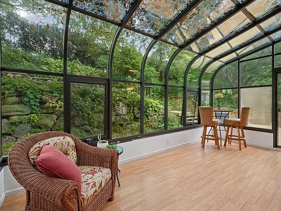 Hardwood floorsCozy fireplaceSpacious deckGlass sunroomStone fire pitNatural lightSpa-like bath
