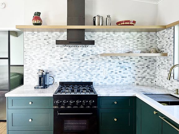 Mature treesLush yardQuiet tree-lined streetNatural-stone countertopsCustom cabinetryPrivate outdoor retreatForest-green tile shower