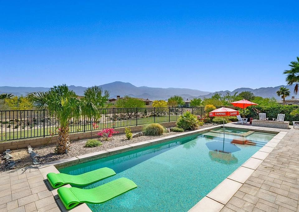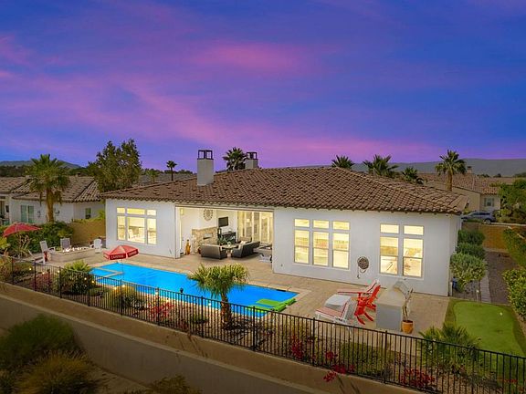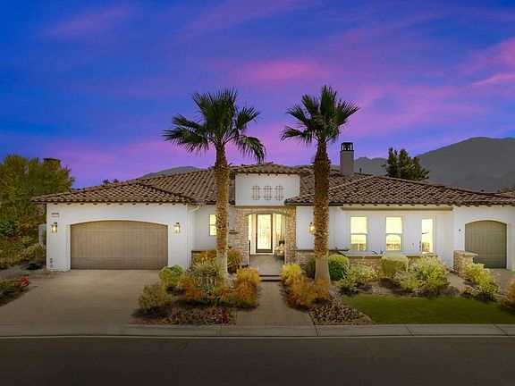 Welcome home to this exquisite property located in Griffin Ranch, a prestigious, guard-gated luxury community in La Quinta. Designed with the discerning buyer in mind, this home offers unparalleled views and an exceptional indoor-outdoor living experience. Indulge in the breathtaking panoramic views that can be enjoyed from the great room, kitchen, dining room, primary bedroom, and the expansive patio. Whether you're hosting family gatherings or entertaining friends, these south-facing views are guaranteed to impress. Experience the epitome of indoor-outdoor living as the great room seamlessly opens to the extended covered patio. With walls of glass, misters, screens, and a cozy fireplace, you can enjoy the perfect blend of comfort and outdoor ambiance. The outdoor amenities are designed for enjoyment, from the built-in BBQ island for grilling to the saltwater pool and spa for relaxation. Spend your evenings around the fire pit, taking in the stunning sunsets. Step inside and be greeted by custom flooring, beautiful window treatments, a great room adorned with coffered ceilings, and a fireplace featuring stacked stone. The chef's kitchen is a culinary delight, boasting stainless appliances, a five-burner range, and exquisite countertops. Adjacent to the kitchen, you'll find a spacious dining room, entertainment areas, and a bonus room. There are also two bar areas, perfect for hosting social gatherings. Retreat to the primary suite with its high ceilings, en-suite bath offering dual vanity sinks, a spacious shower, and a deep soaking tub for ultimate relaxation. The walk-in closet is sure to impress. The guest rooms are thoughtfully designed and provide comfortable accommodations for visitors.This home features an attached Casita with a separate entrance for added convenience. The Casita includes a kitchenette, living room, bedroom, bath, and direct access to the golf cart garage. Griffin Ranch offers an array of amenities for residents to enjoy. The clubhouse is a luxurious retreat with a fitness room, pool and table tennis room, pilates studio, bocce courts, tennis courts, a putting green, and pickleball courts. There's even a doggie park for your furry friends. Relax by the resort-style pool & spa with cabanas, and partake in the numerous social activities held throughout the year. With its prime location, you'll have easy access to world-class golf courses, tennis facilities, shopping, dining, biking trails, theaters, & everything the desert offers.