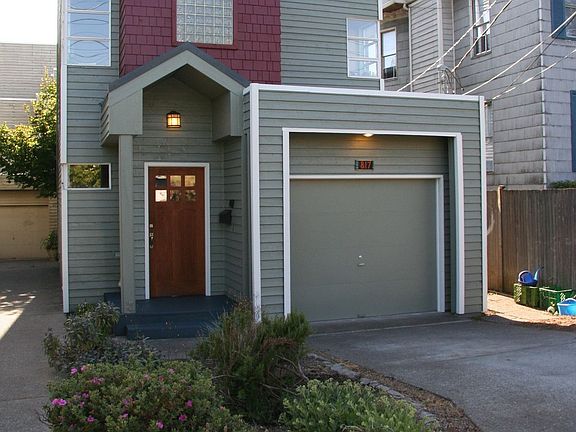Sunny & bright RARE, STAND ALONE townhouse in fantastic location! Bamboo flooring, vaulted ceilings & TWO west facing DECKS w/Olympic, City & Space Needle views. Open main floor plan featuring kitchen/living/dining w/wood burning fireplace & clerestory windows. Top floor private master suite w/spacious tile BA/walk in closet. Lower level + 2 BD/full BA. Accessible one car garage w/second off ST parking spot. All freshly painted w/home warranty! Full size W/D. New SS dishwasher/Frig. Urban Hip!