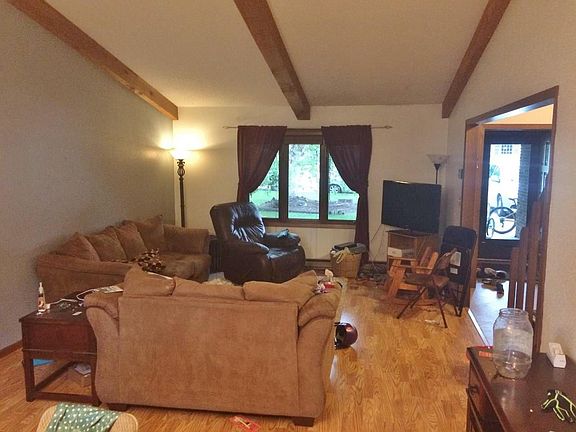 Beautiful two story home with attached double garage, 5 bedrooms, 2 bathrooms, natural wood siding, and shake shingles nicely situated in SW Rugby. Functional floor plan with wood beam ceilings in the living room and foyer with open staircase that extends up to an open second floor balcony.