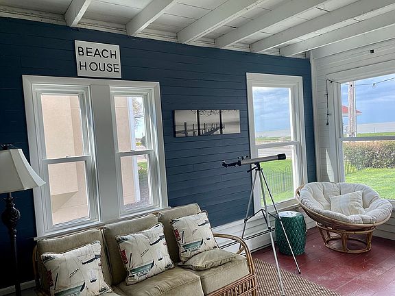 4 bedroom, 2 bathroom charming main home on Lake Erie with completely separate 2 bedroom, 2 bathroom guest home overlooking Sandusky Bay. Only home on road with 2 separate homes on one lot. This is a lake to bay property with full private beach, new in 2022 steel seawall and new steel and concrete boat dock with double 10,000 lb lifts. Main home has new siding and new windows in 2018. Enjoy beautiful water views from every room. Quick access to the islands and 1 mile to Cedar Point. Property can comfortably sleep up to 14. Lowest priced home for sale on Cedar Point Road.
