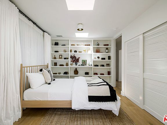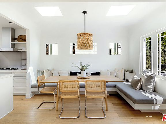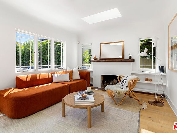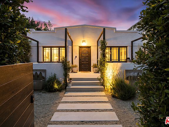 Tucked on a palm-tree lined street behind mature hedges is this completely renovated yet quintessential California bungalow. The front gate opens to a charming courtyard with a large front porch that offers seating on either side of the custom wood front door. Skylights and wide oak floors create a coastal feel throughout the home. The main living room is set around a cozy fireplace, and original windows allow views of the greenery surrounding the home. The dining area has built-in seating and flows right into the completely updated kitchen with high-end appliances and a separate laundry area. The first bedroom includes built-in shelving for easy storage, and the renovated bathroom has an expansive vanity, shower, and separate soaking tub. The second bedroom opens directly to the beautifully landscaped, private back patio with custom seating, firepit, and an outdoor grill. Surrounded by green palms and an abundance of bamboo, the backyard is a lush and tranquil retreat. Just beyond the patio is a large separate bonus space with wood beam ceilings, a modern bathroom with an additional skylight, and steel glass doors that both open to create a wonderful indoor/outdoor flow between the main house, the oversized back deck, and bonus space. Main house is approximately 1,128 square feet and the bonus structure is approximately 437 square feet. Located just minutes from Abbot Kinney, the Venice Canals, and the beach, this home provides the perfect zone to relax and unwind in the heart of Venice.