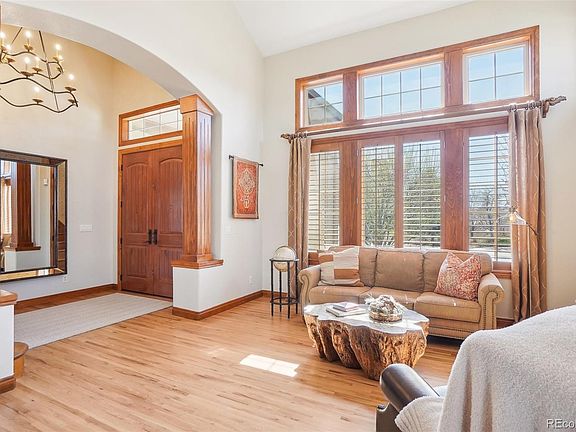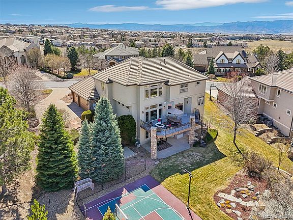 Nestled in the prestigious Highwoods neighborhood, this impeccably maintained and thoughtfully updated home offers an exceptional living experience designed to impress even the most discerning buyers. The inviting front porch opens to the dramatic foyer where you are greeted by soaring vaulted ceilings, modern lighting and a gracefully curved staircase. Rich hardwood floors and intricate wood accents create a warm, inviting ambiance, seamlessly blending luxury with comfort. At the heart of the home, the chef’s kitchen is a culinary dream. Cherry wood cabinetry, a generous island and sleek stainless steel appliances set the stage for both intimate meals and grand entertaining. Gleaming Quartz countertops, custom backsplash and generous island with wine chiller enhance both style and function. Meals and conversations flow from the breakfast nook into the family room with abundant windows. Imagine spending time around the gas firepit on the elevated deck. Upstairs, the opulent master suite is a serene retreat, offering views of the Rocky Mountains and the Denver skyline. The primary bath is a spa-like escape with timeless finishes and thoughtful design. Three additional bedrooms complete the upper level—one with a private ensuite bath, while the other two share a well-appointed Jack and Jill bath, ensuring privacy and convenience. The finished basement is an entertainer’s paradise, offering endless possibilities. Host a movie night in the open theater area or challenge friends to a game of pool or ping pong. There is also space for exercise, crafts or a play area with the bathroom nearby. Walk out to the covered patio and savor the outdoor living spaces that allow you to relax, surrounded by beauty. The backyard with lighted sport court allows for so many recreational activities without having to leave home. Highwoods features a private community pool and pickleball courts! This extraordinary home is the perfect blend of elegance, comfort, and modern convenience.