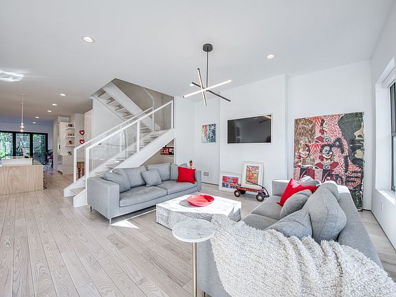 The main level features tall ceilings, solid ash floors, and a chef's kitchen with Bosch double ovens, Bosch dishwasher and Thermador fridge/freezer. A breathtaking quartz slab anchors the kitchen and ties into matching quartz counters with waterfall edges of the bar area equipped with Vitamix and sorted glassware. A large dining room sits in front of the rear glass wall that opens to a private garden patio. It's seamless indoor-outdoor living complete with firepit and hot tub.