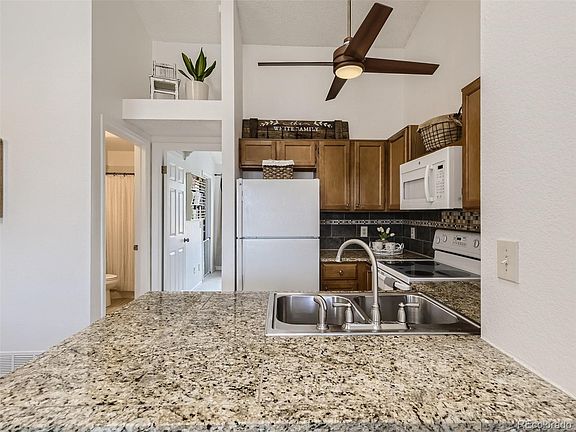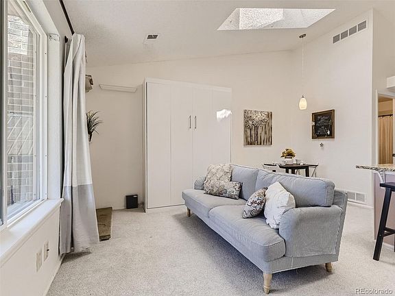 Charming Updated condo in Highlands Ranch! West facing unit with beautiful mountain views. This Condo is open and bright with vaulted ceilings and sky lights. The Family Room is complete with fireplace, new carpet, newer paint, and a Murphy Bed for additional sleeping room if needed. The kitchen features granite countertops, newer backsplash, and abundant cabinetry with undermount lighting, and all appliances are included. The bedroom also has new carpet with a walk-in closet featuring built-ins. The updated full bathroom and laundry closet offer the convenience of an in-unit stacked washer and dryer. This condo is complete with a covered front porch, perfect for enjoying the beautiful Colorado scenery. One reserved parking pace right behind the Condo. Sugarmill Condos is a well-maintained and quiet community and walking distance to Kistler park, Grocery Stores, Restaurants, etc. Ideally located in Highlands Ranch, an active community that also provides miles of walking trails and four state-of-the-art rec centers with indoor and outdoor pools, weight rooms, sport courts and much more.