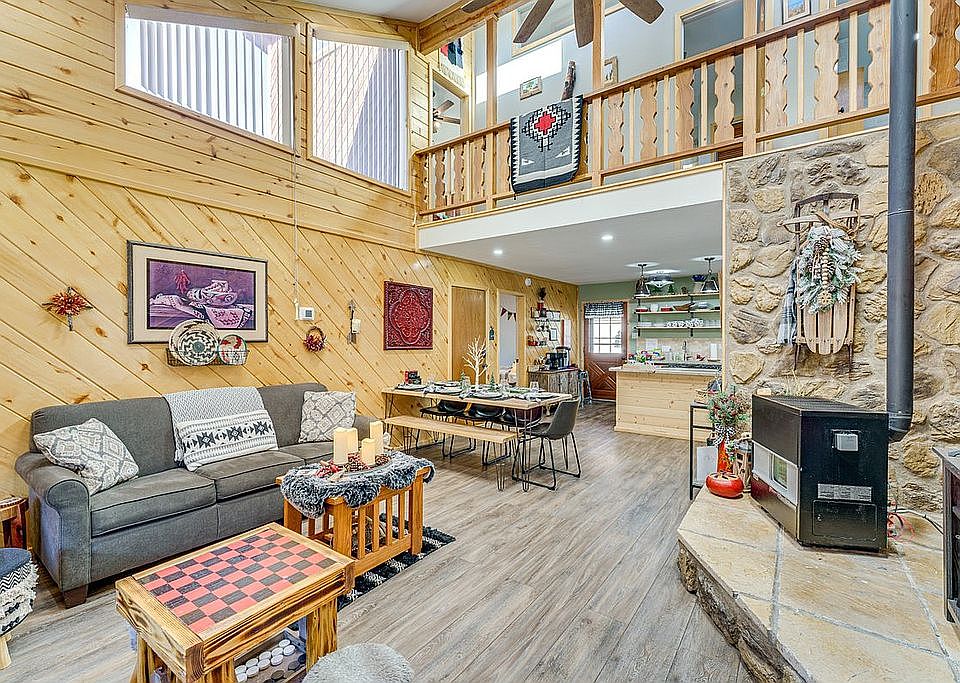 I love the cozy, welcoming feel of this home with lots of natural wood and windows to let the sunshine inside. Love looking out window at mountains while in the shower. Warmest house ever!