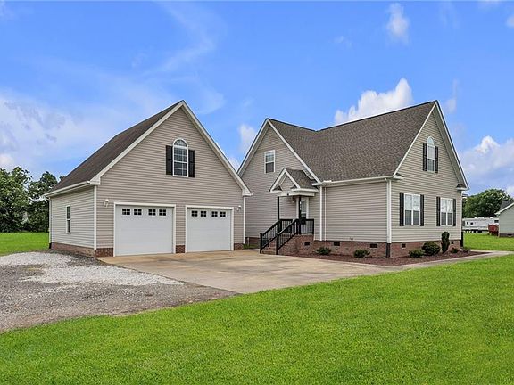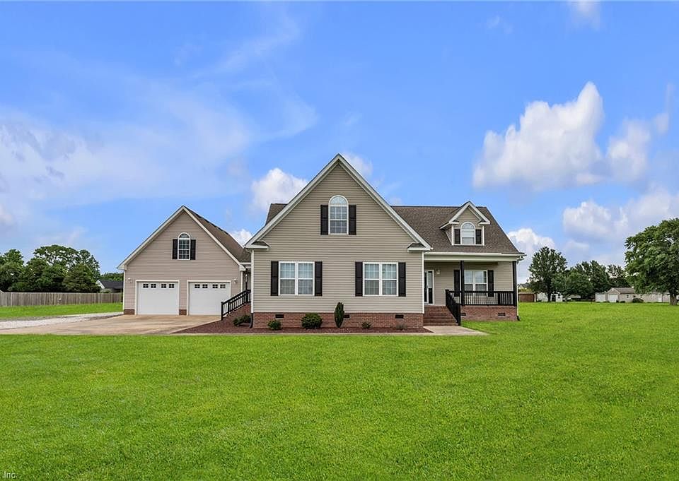 Beautifully set on 1.56 acres, this spacious home features a 30x28 oversized detached garage with an unfinished room above—perfect for storage, a workshop, or future expansion. With no HOA and no flood insurance required, it’s a rare find! The inviting Great Room offers a gas fireplace, while the kitchen shines with stainless steel appliances, ample cabinetry, and a breakfast bar. The dining area opens to a covered deck overlooking the expansive backyard—ideal for relaxing or entertaining. The main level includes a primary suite with a private bath, two additional bedrooms, and a full bath. Upstairs, you'll find a fourth bedroom, two flex rooms, and another full bath—perfect for guests, a home office, or a playroom. Conveniently located near the NC/VA line for an easy commute, 30 minutes to Elizabeth City, and under an hour to the OBX beaches. This home offers space, flexibility, and freedom—schedule your showing today!