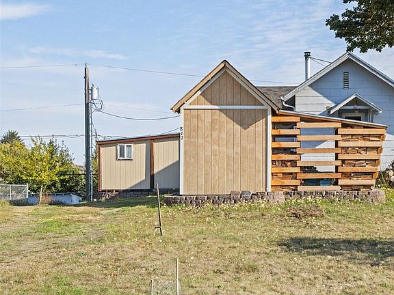 Enjoy tranquil city living in this lot-and-a-half home, featuring southern mountain views & ambiance of simplicity. The expansive front yard invites creativity (second living unit, orchard, or?), while partial views of the Straits create a northern backdrop. Enjoy the convenience of street & alley access, finished outbuilding, shed & detached office boasting bird's-eye views & private deck, perfect for peaceful workdays. Inside, the home features laminate plank floors, custom built-in storage, wood stove & walk-in pantry, among other custom details. The massive bedroom w/tall ceilings & oasis mural leads to an organized closet. Step outside to a patio complete w/hot tub & grand retaining wall that enhances both privacy & elevation!