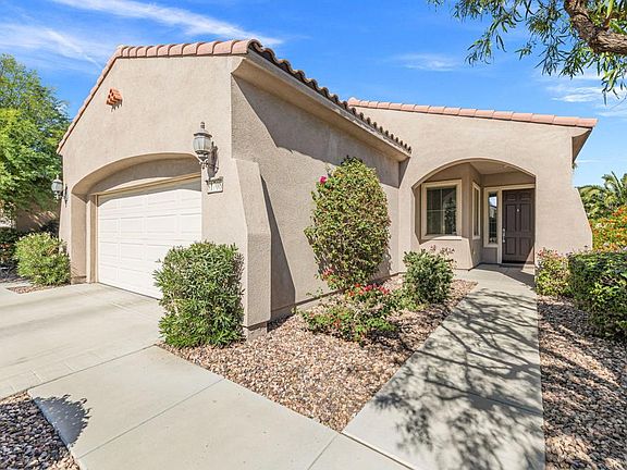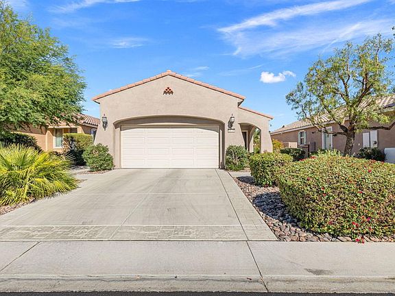 Welcome to this charming Canterra floor plan offering 1,257 sq. ft. of comfortable living space in Sun City Shadow Hills. The inviting great room features tile flooring, t large windows, and a sliding glass door that fills the space with natural light and provides easy access to the backyard. The kitchen showcases sleek stainless-steel appliances, granite countertops, and abundant cabinetry with room for a cozy breakfast nook. A separate laundry room adds everyday convenience. The primary suite offers carpet flooring, a large picture window overlooking the backyard, a walk-in closet, and an en suite bathroom with dual vanities. The guest bedroom is located near a full bath with a shower-over-tub combination. Step outside to enjoy a spacious beautifully landscaped backyard featuring a covered patio with an extended patio. The exterior includes an additional concrete walkway from the front to the back. This home is well maintained and shows true pride of ownership! Sun City Shadow Hills is an active 55+ community offering resort-style amenities, including two clubhouses, championship golf courses, fitness centers, pools and spas, pickleball and tennis courts, and a variety of social clubs and activities designed for every interest. Enjoy the perfect blend of recreation, relaxation, and connection in this vibrant desert community.