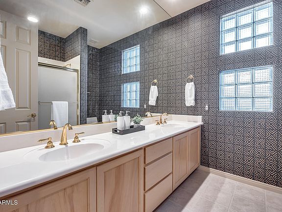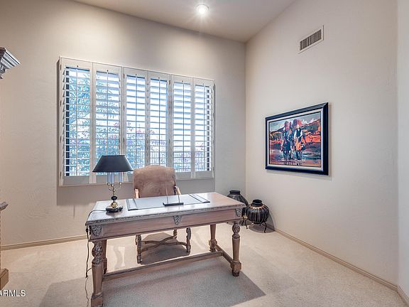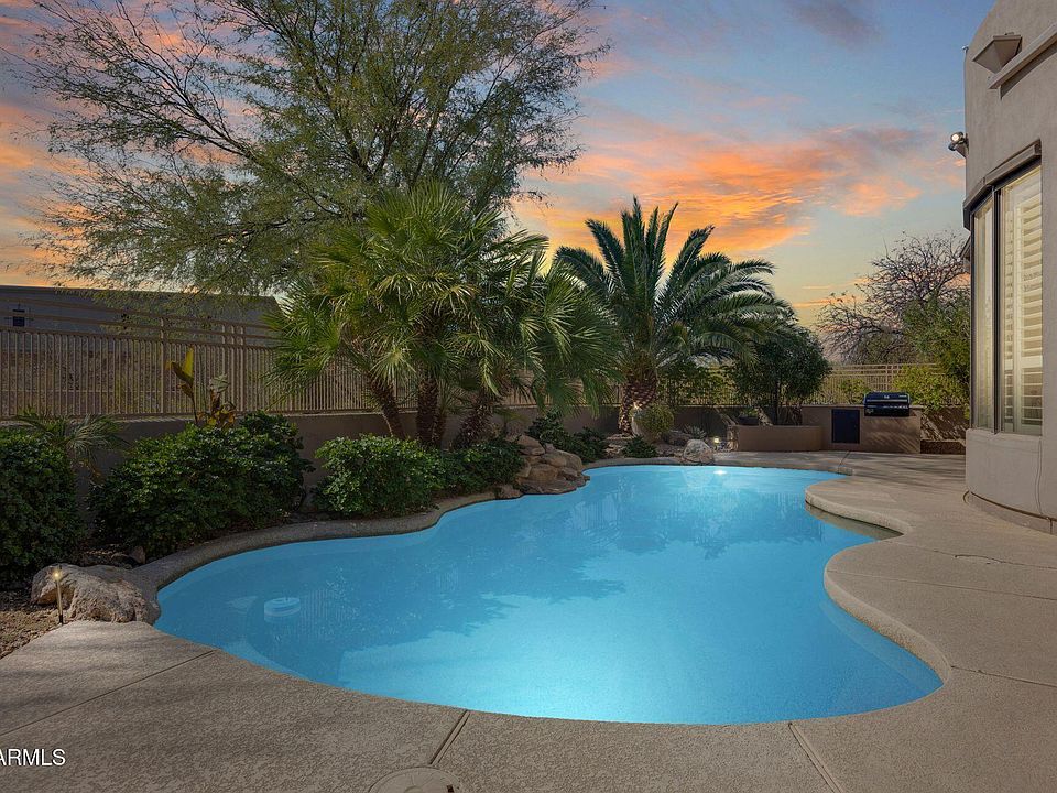 MOVE-IN READY IN GRAYHAWK! Enjoy soaring ceilings, well-maintained flooring, custom shutters throughout, whole home audio system, & an open floor plan. The bright kitchen features an electric cooktop, built-in microwave & wall oven, island, RO system, & breakfast room. The massive primary suite boasts an ensuite bath & huge walk-in closet. Outside, relax in your private backyard with a covered patio, sparkling pool with a water feature, lush landscaping, & views of the adjacent common space & walking path. Experience resort-style living in one of Scottsdale's most prestigious communities with mountain views, two championship golf courses, 30+ miles of trails, parks, gated neighborhoods, community events, & easy access to top-rated schools, dining, & shopping!