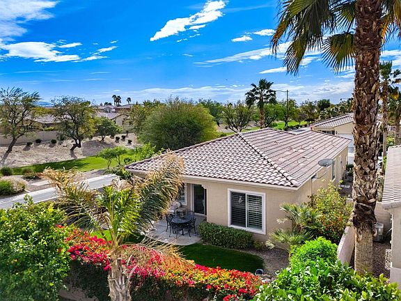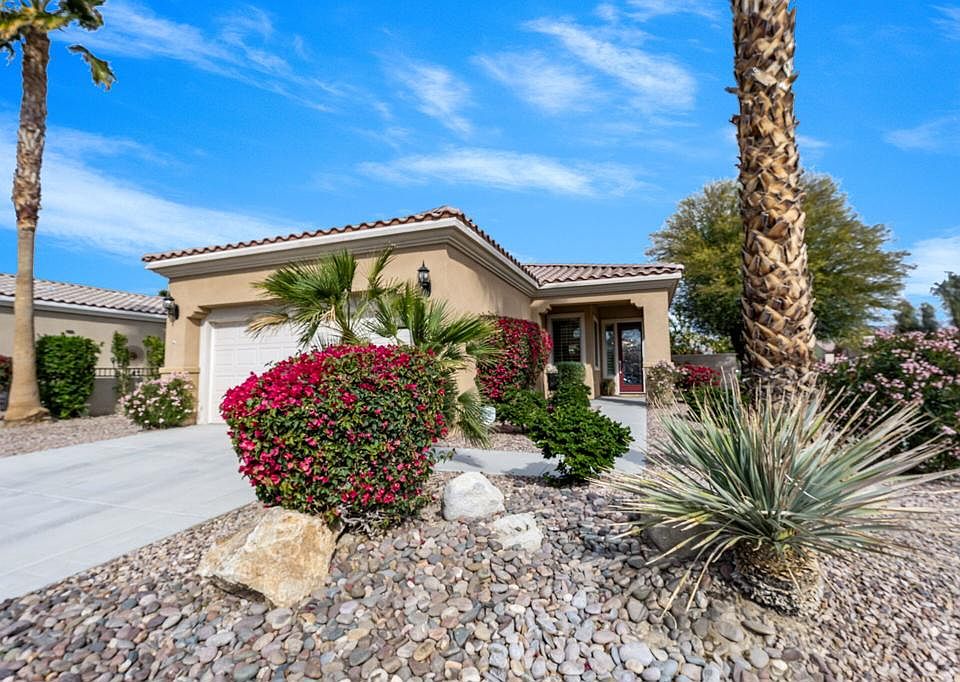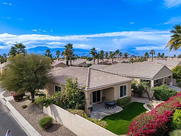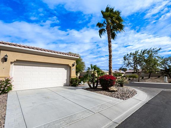 Discover your dream retreat at 81720 Avenida Parito in the heart of the exclusive, gated 55+ community of Sun City Shadow Hills, Indio. This beautifully maintained Canterra model home offers 1,257 square feet of living space, featuring 2 bedrooms and 2 bathrooms, crafted for those who seek both comfort and style. Step into an open floor plan where elegance meets functionality, with stylish tile flooring throughout the main areas, complemented by plush carpeted bedrooms. The kitchen is a chef's delight, boasting granite countertops, stainless steel appliances, and ample cabinet space with pull-out shelves for ease. The master suite serves as your personal sanctuary, complete with dual vanities, a walk-in closet, and views that greet you with the tranquility of the surrounding mountains. The home's exterior is just as inviting, with a low-maintenance yard perfect for relaxation or entertaining, set on a serene corner lot that enhances your privacy. Enjoy the community's vibrant lifestyle with access to a golf course, dog park, and numerous social clubs, all contributing to an active and engaging life. With energy-efficient updates like ENERGY STAR qualified HVAC systems and modern conveniences such as ceiling fans and faux wood blinds, this home combines luxury with practicality. Don't miss your chance to embrace this lifestyle; call today to schedule your private tour and see why 81720 Avenida Parito is not just a home, but a lifestyle choice for those looking to enjoy their golden years in style and comfort.