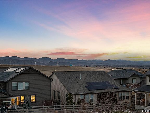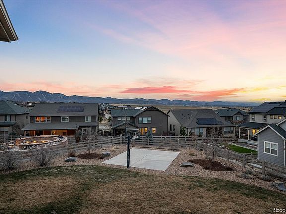 Welcome home to the darling of Sterling Ranch! This lot is the largest lot in the community. 5 bed + office offering breathtaking PANORAMIC MOUNTAIN VIEWS, a sport court, a spacious patio off the custom walkout basement, hot tub, built-in fire and multiple garden areas. This home is also In-Law Friendly! Nestled across from park & easy jaunt to Roxborough State Park, Waterton Canyon & Chatfield Reservoir and including an annual State Park Pass! Close to Golf, hiking, water and easy freeway access to mountains! Upon entering this masterpiece, you'll be greeted by striking wood flooring leading to the chefs kitchen you’ve dreamed about with white cabinetry with 42" uppers, crown molding, striking quartz countertops with a white subway tile backsplash, stainless steel appliances, a large corner pantry, a massive island with an under-mount sink, and a breakfast nook which makes this space flexible for all of your dining and entertaining needs. The kitchen seamlessly opens to the spacious living room & covered back deck, providing the perfect spot to relax and enjoy the stunning mountain views. You'll be impressed by the main floor expansive primary bedroom, featuring coffered ceilings with crown molding, mountain views, and an impressive primary bathroom. The primary suite includes a luxurious 5-piece bathroom & large walk-in closet that conveniently connects to the laundry room. Additionally, the main level comprises a large private home office, three more spacious secondary bedrooms & two additional full bathrooms. In the stunning basement you will  discover the rare architectural ceiling features, an elegant wet bar, a spacious dining area, custom lighting and built-ins and a media room which is  ideal for entertaining. The basement also offers a guest room, a bathroom, and ample space for a game room or home gym. Step outside to the backyard, where you'll find a space that's nothing short of perfection. With so much more to offer, this home is truly a showstopper.