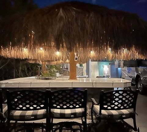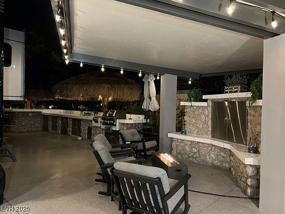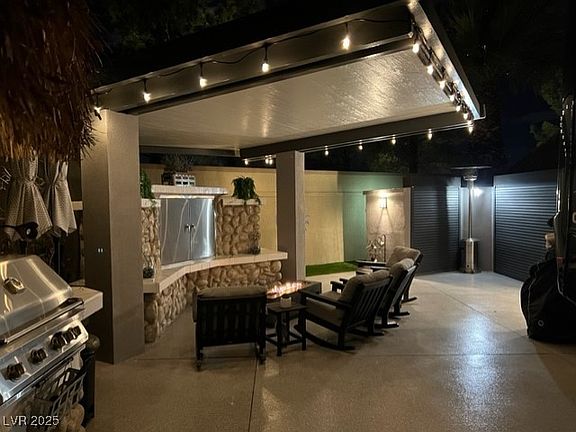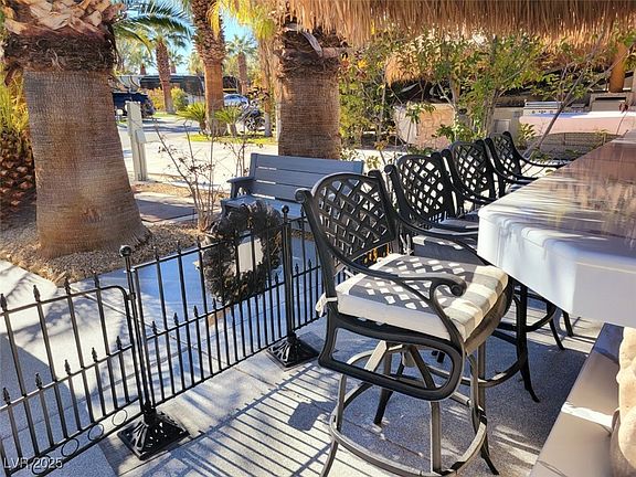 Located within the Class A Las Vegas Motorcoach Resort, this manicured south facing perimeter site is fully decked out with two large shade palapas that encompass a full kitchen with bar top seating and lighting as well as a large cantilever structure with roll down shades where you can relax in front of the fire and watch TV. There’s also epoxy coated flooring, large storage areas with roll up doors and hookups for a washer and dryer just to name a few of the added extras this site offers.