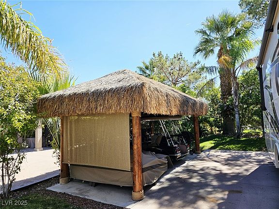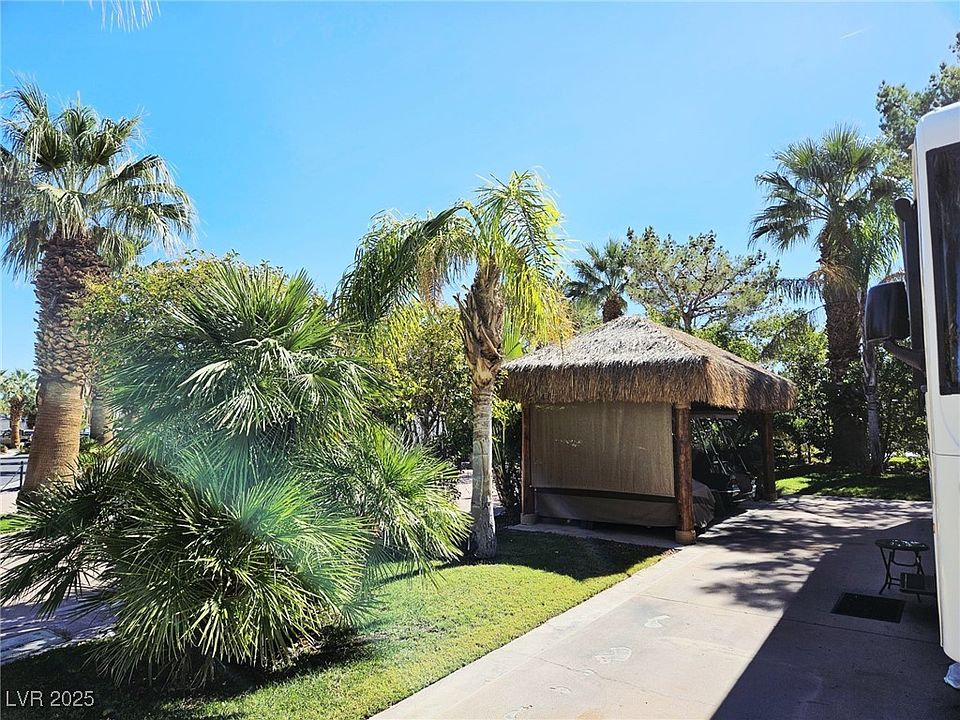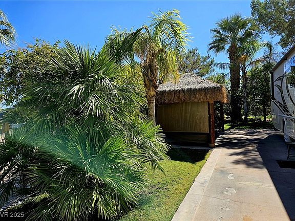 Located within the Class A Las Vegas Motorcoach Resort, this tropical north facing site features a variety of palms and cool green grass to create your own sanctuary. Featuring a large palapa with roll down shades that creates a cozy seating area for you to relax or even entertain friends. Also, it’s conveniently located near one of the resorts satellite facilities and pools.