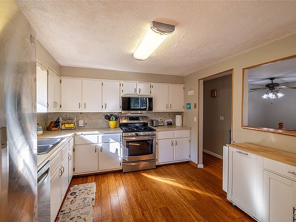 Inside, you’ll find hardwood floors throughout the main level and a kitchen that opens to a bright living and dining area. Down the hall, discover three bedrooms, with the largest offering a walk-in closet.