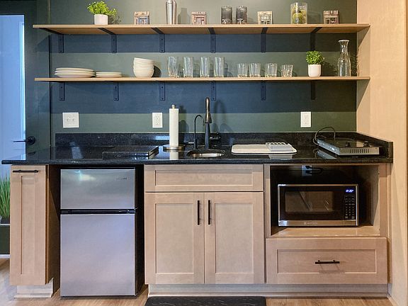 The kitchenette comes stocked and capable of everything you need except Thanksgiving dinner: fridge with freezer, countertop 2-burner cooktop, and a 3-in-1 microwave/air fryer/oven. The living room with ample seating features a 45" TV on a swivel wall mount for viewing from elsewhere in the apt. There's a high bar with bar stools for a workstation for working from home! Across from the bathroom is a laundry closet, fully equipped with everything you need.