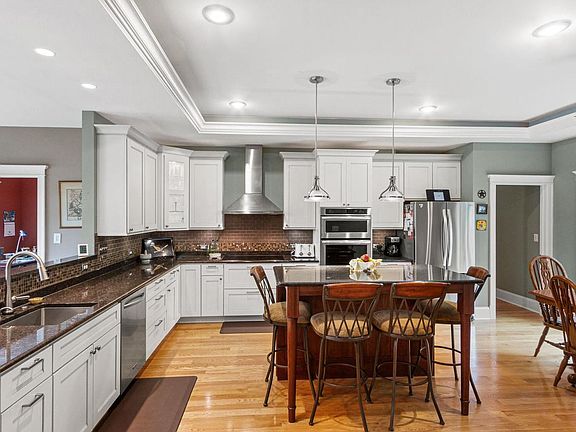 Lake Camelot Waterfront Home! Step inside a spacious foyer and be awed by an exceptionally light and open quality home with million dollar views! A gorgeous kitchen with tray ceiling featuring granite tops, light cabinetry and breakfast bar, flows seamlessly into the sun room and study which are rich in endless lake vistas. In the original A-frame inspired wing, find rustic wood lined walls, high vaulted ceilings, and soaring windows. Relax in the living room by a unique tile fireplace, deluxe wet bar, and sliding door to the deck. The primary suite comes with its own balcony and loft overlook. Heated tile floors, generous rooms downstairs, plus a LL walk-out, two utility areas and a safe room. Loads of sandy beach, and a heart-stopping 50' long garage! A home for all seasons! In Rome!
