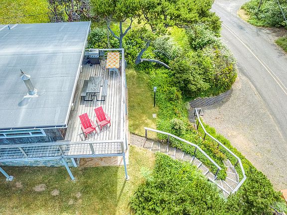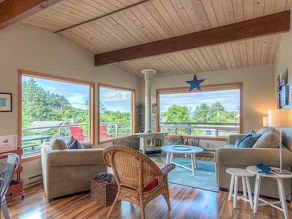 Enjoy the beautiful views inside and out of this relaxed and charming two story home. Perched above Nehalem Road, the house is accessed via a curving staircase built along a beautiful Shore Pine tree. The upper floor features an open floor plan with a modern kitchen with new dishwasher, dining table with seating for six, living room with large windows to enjoy the ocean view, and a charming wood stove. Step through the sliding glass doors onto the large upper deck perfect for relaxing with a glass of wine and watching the sun set over the Pacific Ocean. There is also an additional entry deck that is great for relaxing in the sun or getting some shade. The lower floor features a large bedroom, second living room, full bathroom, laundry closet and utility closet.