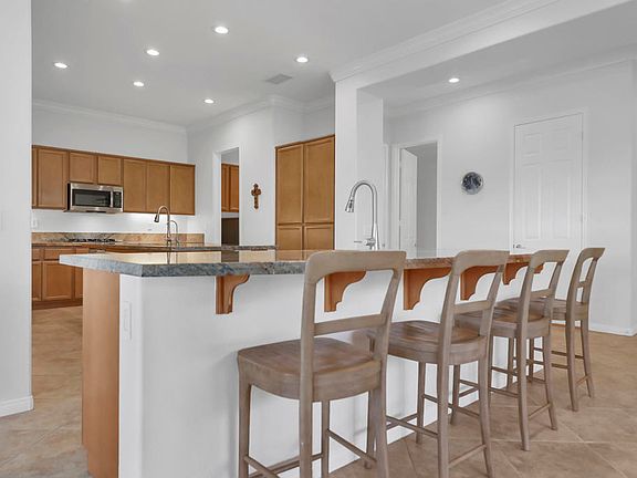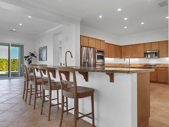 Outstanding value for this pristine Talea plan in Trilogy at La Quinta. This home is super clean and feels like a new home, as there have been lots of updates over the past few years. Open floor plan, tile floors throughout, recessed lights in every room, 10 foot ceilings with crown molding, gourmet kitchen with two kitchen islands and two sinks, double oven and a new refrigerator, dishwasher and microwave. Complete whole house water filtration system as well as a reverse osmosis system in the kitchen. Covered patios off the kitchen (new pergola in 2023) and great room. Expansive primary bedroom with huge closets and custom pull down hanging racks. Primary bath with dual vanities and separate shower and bathtub. One of the guest bedrooms has an attached bath, and the other is set up as an office/bedroom. Dimmer switches on almost every light in the house. Epoxy flooring in the oversized garage. Newer washer and dryer with raised pedestals. Newer AC units (2022) with an air scrubber system. Newer interior and exterior paint (2022). Private backyard is surrounded by a green ficus hedge, and there is room for a pool and additional landscaping. Beautiful views of distant mountains from the front and backyard. Home is being offered furnished and the golf cart is included.
