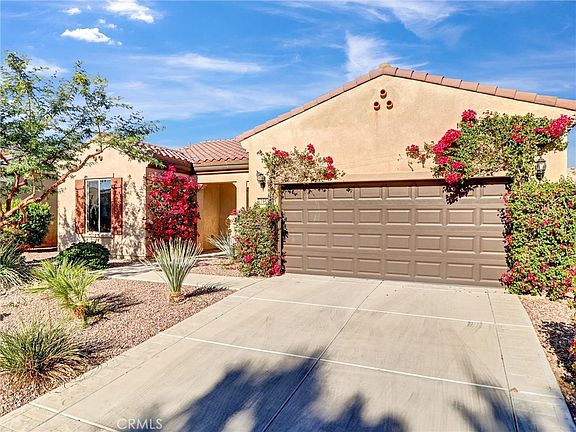 Welcome to this beautifully upgraded 'Hospitality' model in phase 3, Sun City Shadow Hills, an active +55 community. This community is desert living at it's best and offers many clubs and activities for many lifestyles. This home has a spacious open floor plan, with upgraded large floor tile throughout most of the house except the 3 bedrooms have wood-like plank flooring. There are 10 foot high ceilings with ceiling fans. The great room is very spacious with adjacent dining area and sliding glass door out to the covered patio. The kitchen has beautiful quartz counters with a gorgeous updated subway tile backsplash. There is a large island and stainless steel appliances. The 2 full bathrooms have Piedrafina marble counters. The primary bathroom also has large spa type tub, separate walk in shower, double vanity and large walk-in closet. Additional features include a separate laundry room, 2-car garage with additional 2 foot extension. The backyard has full grown trees and large patio area. The amenities in this low HOA dues community feature, pickleball courts, tennis courts, bocce ball, 2 outdoor pools and 1 indoor pool, 2 gyms and spacious room for exercise classes. There are 2 dog parks,beautiful walking area, 2 golf courses with a separated putting course, 2 club houses plus there is the Shadows restaurant! The community also has 24/7 guardgates and transponder only secondary gates. Sun City Shadow Hills offers a blend of comfort and lifestyle with a sense of community.