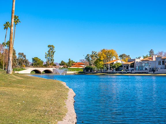 One in a Million Dollar View. The home is newly furnished with large flat screen streaming televisions. Brand new pots, pans, dishes, and linens. The home is a few steps from heated community pool and spa. There is a pickleball court, tennis court and basketball. This exceptional Patio Home: 3 bedrooms- 2 bathrooms- 2 car garage. You have a waterfront private patio off master bedroom and living room with Camelback Mountain Views. The home is elevated above the lake for privacy.