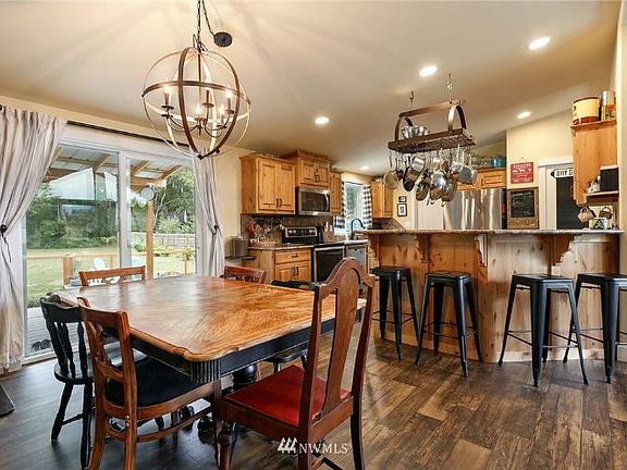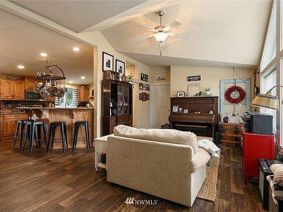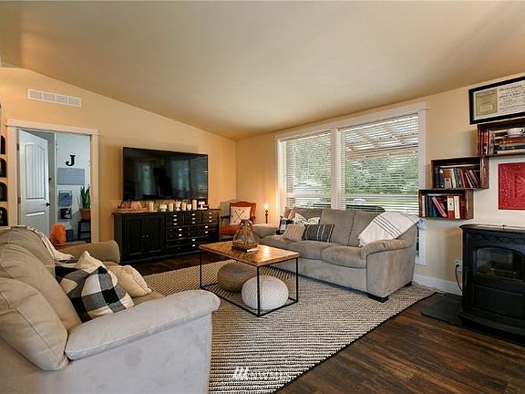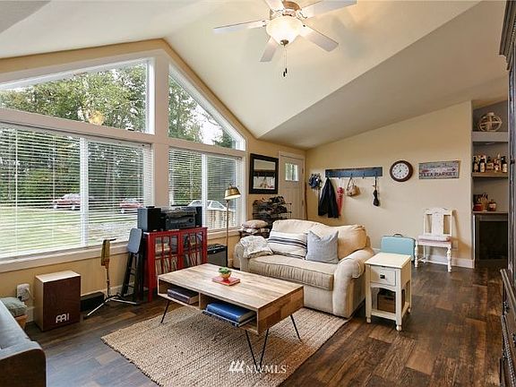 No flooding here! There's room for everyone in this young 4 bed 2 bath manufactured home on level acreage. Open floorplan with two living areas and a roomy dining area at the heart of the home. The owner's suite is separate from the other bedrooms, a truly private space. Features a walk in closet and his and hers vanity in the owner's bath. Enjoy the afternoon sun in the inviting outdoor spaces including a large covered back deck, firepit and covered barbecue area, fenced, raised garden beds and lots of room to run and play in front and back yards. If the summer heat is too much, sit under mature trees at the back of the property. Two small outbuildings w power provide extra storage and or a peaceful and quiet flex space.